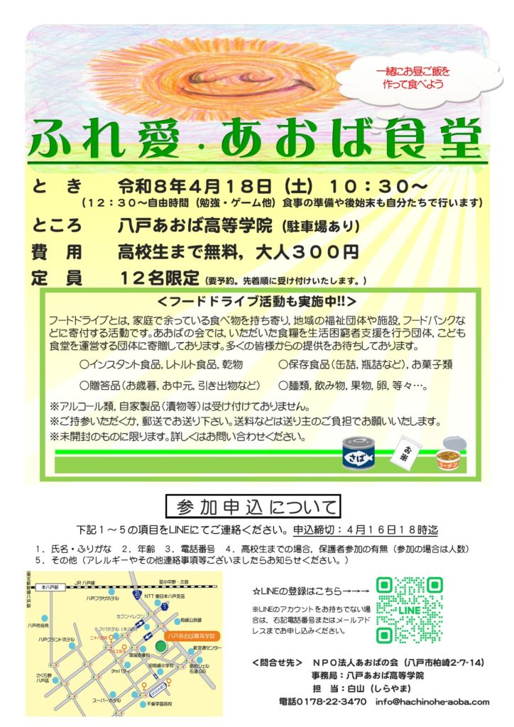 ※こども食堂とあわせて,「八戸こども宅食おすそ分け便」を偶数月最終日曜日に実施しておりますので,どうぞご利用ください。食材のご提供もお待ちしております。詳しくはこちら。